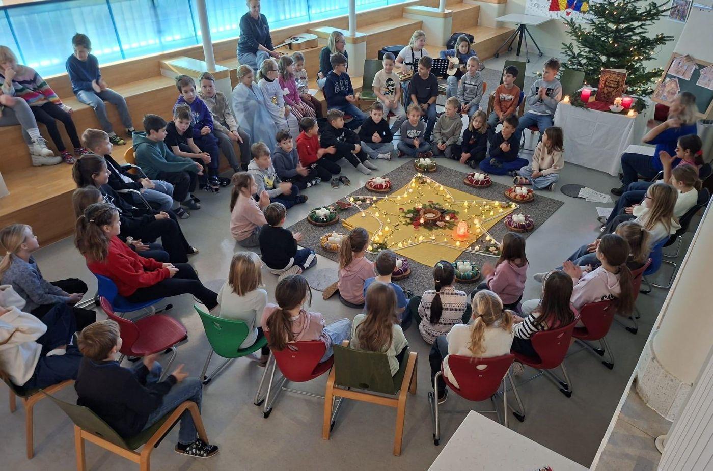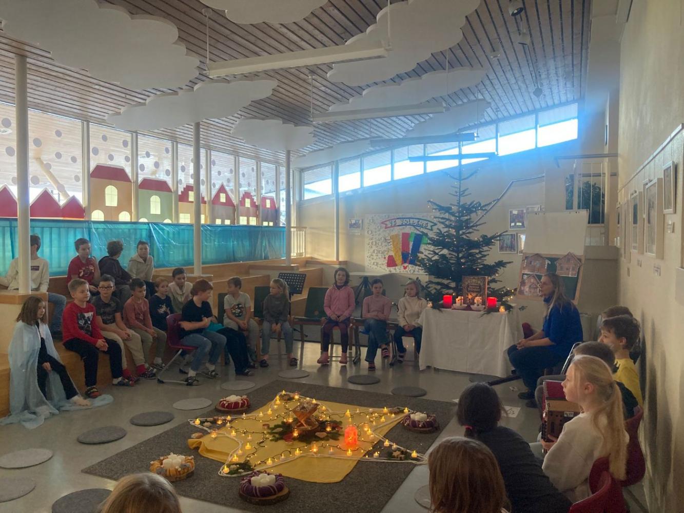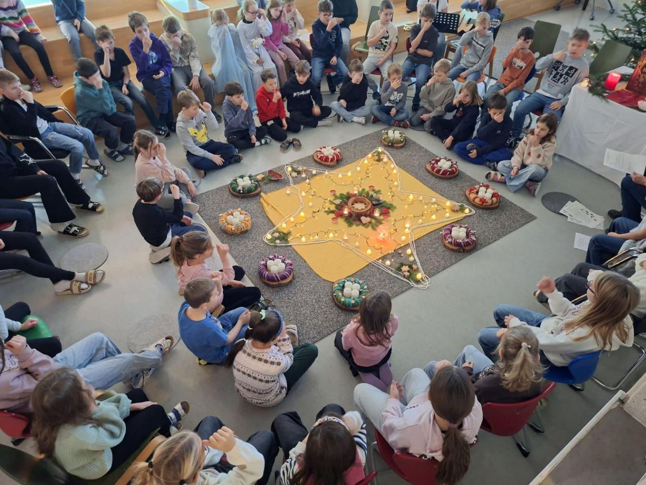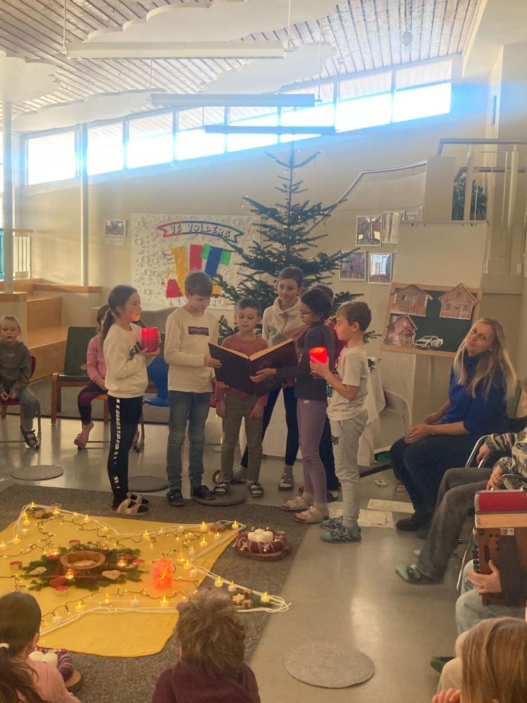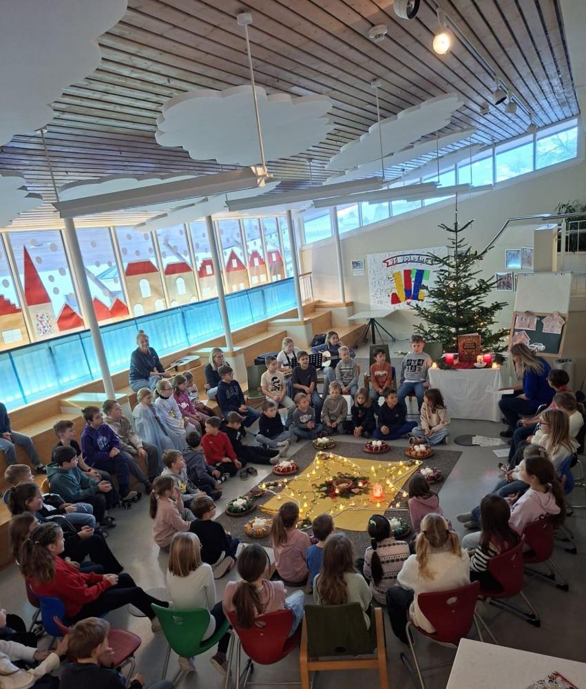 Adventkranzweihe von Stefanie Niederhauser 01. Dezember 2025 Advent Am Freitag trafen wir uns in der Aula, um bei Kerzenschein, mit schönen Liedern und einer weihnachtlichen Geschichte und mit der Segnung der Adventskränze den Beginn des Advents in unserer Schule zu feiern. Schön war's!