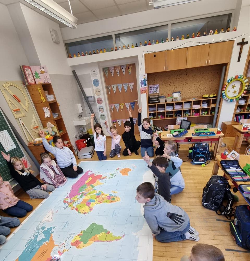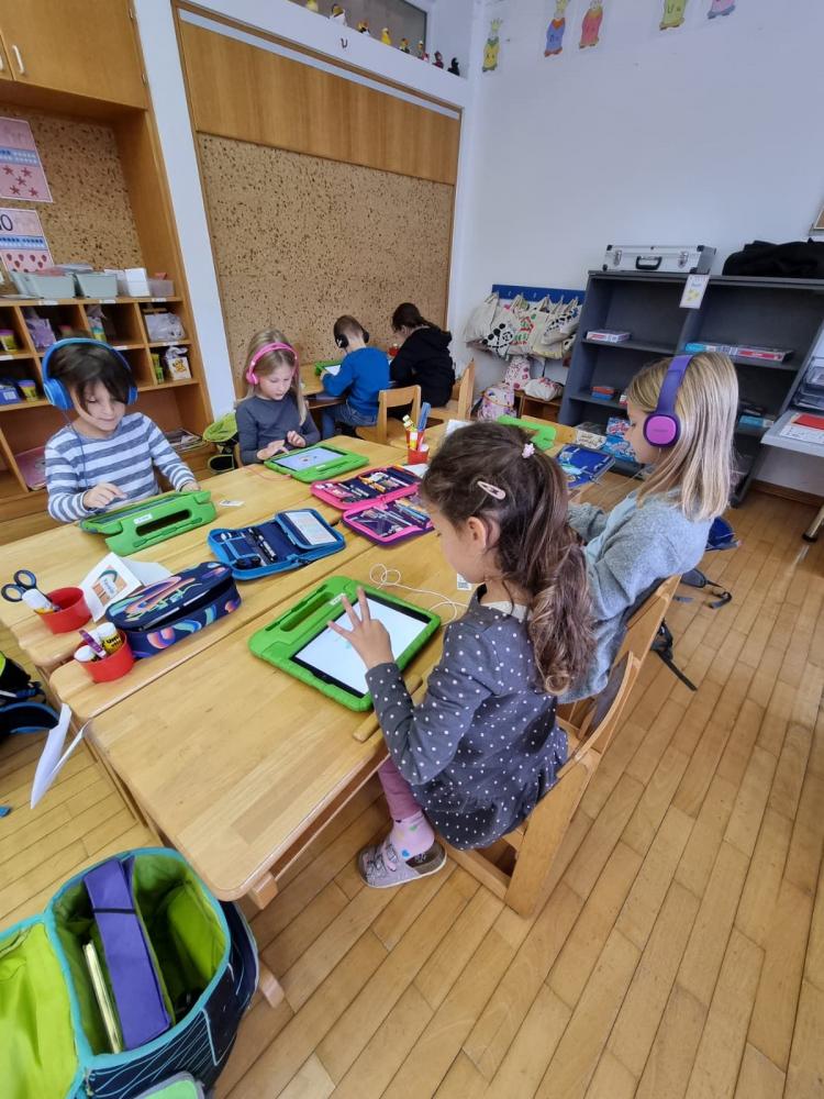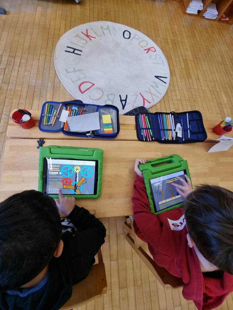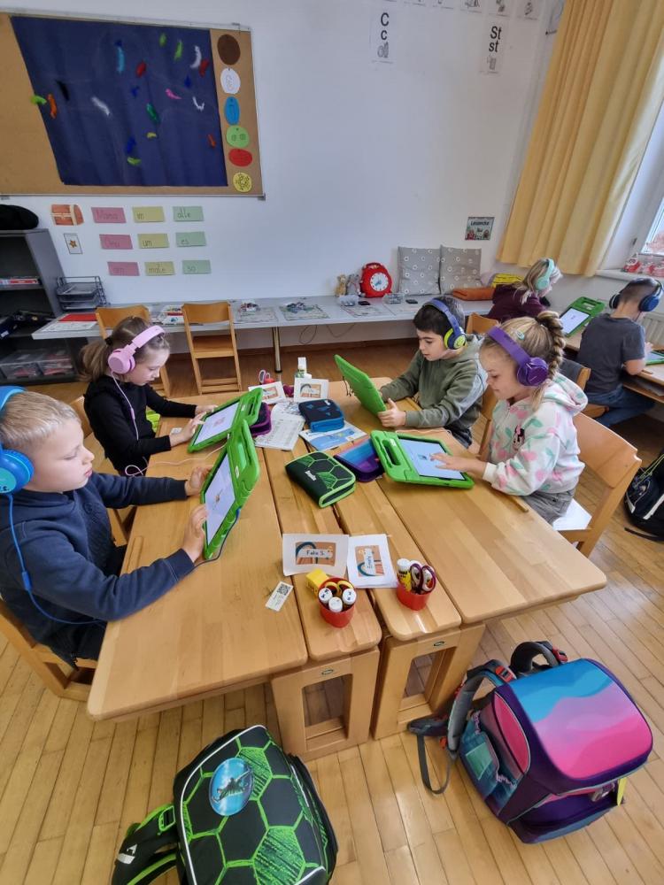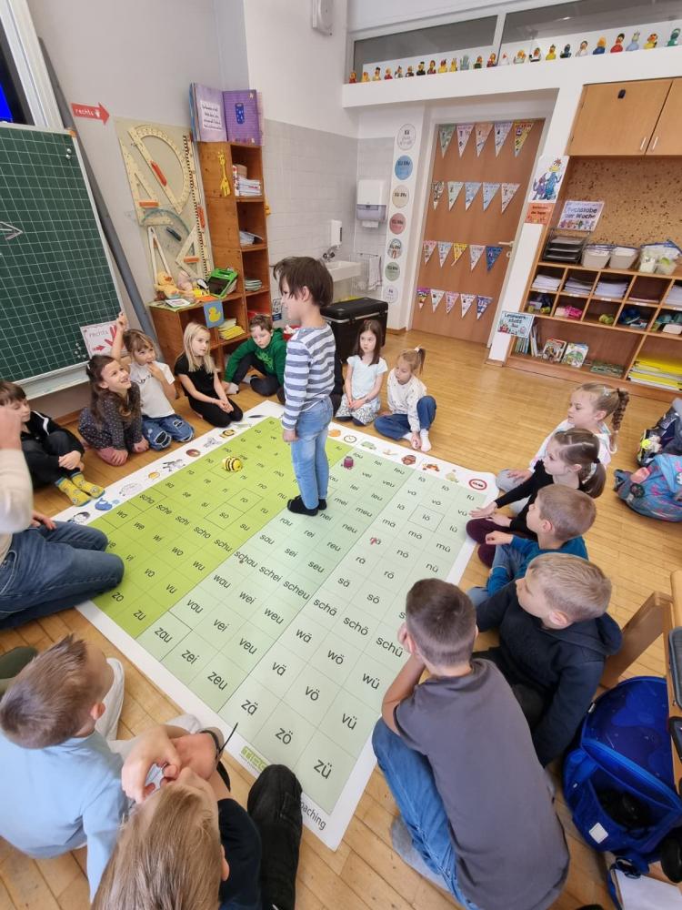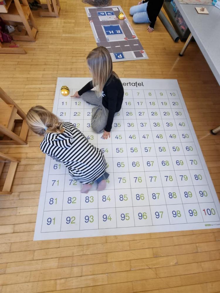 Dieser brachte den Kinder spielerisch in zwei Workshops den Umgang mit einem Tablet näher und entdeckte mit ihnen gemeinsam die Lernplattform Anton. Zusätzlich konnte die Klasse mit Hilfe von Bee-Bots Wege programmieren, somit die Raumlage rechts/links/oben/unten üben und gleichzeitig Silben festigen, eine Weltkarte lesen und kleine Rechnungen lösen.