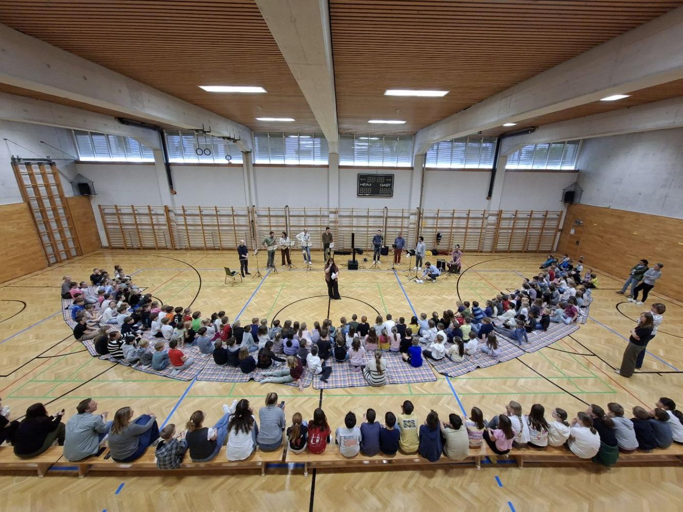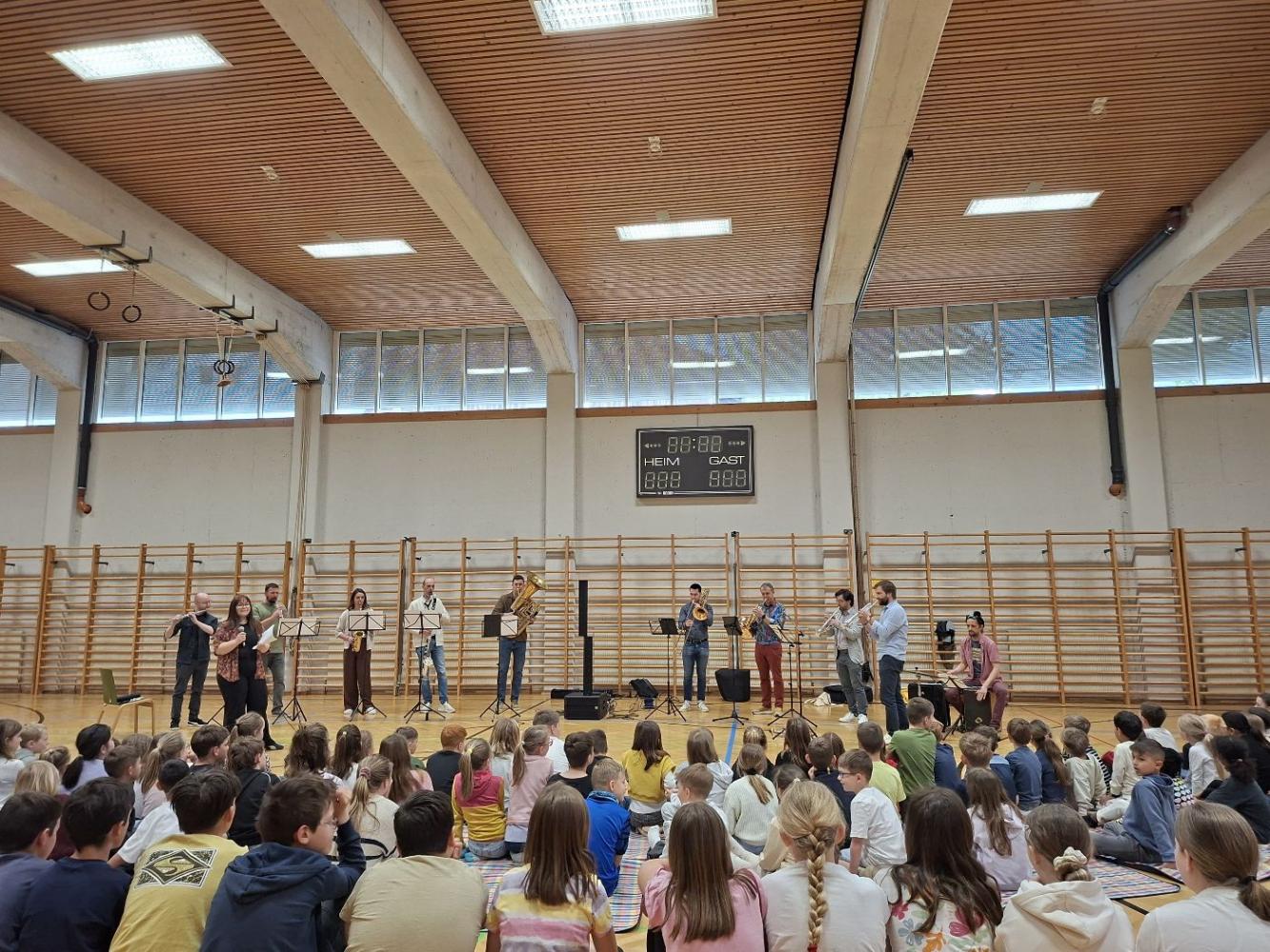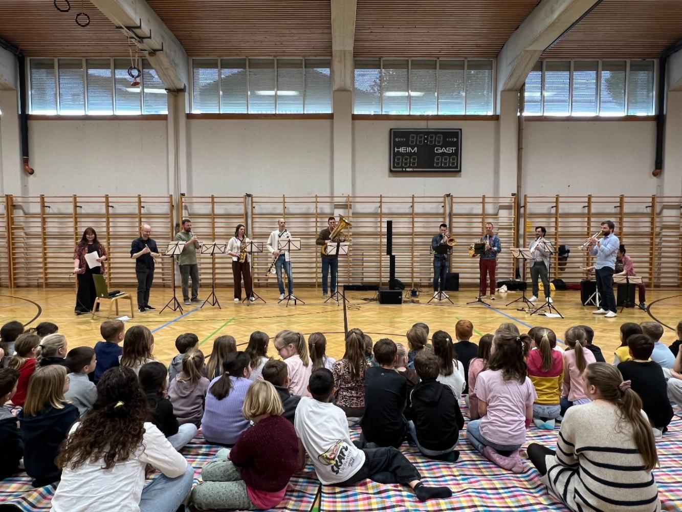 Heute durften wir in unserem Turnsaal ein ganz besonderes Erlebnis genießen: ein „Picknickdeckenkonzert“ der Musikschule Wattens. In gemütlicher Atmosphäre präsentierten die Musikschullehrer:innen die Geschichte der kleinen Flöte „Piccolina“ und begeisterten uns mit wunderschönen Musikstücken auf Holz- und Blechblasinstrumenten.