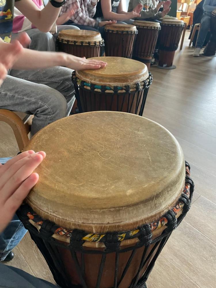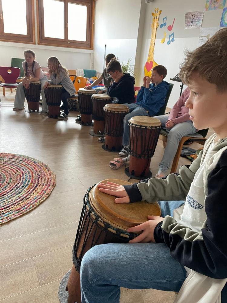 Die Kinder der 4b-Klasse durften bei einem Trommelworkshop ausprobieren, wie die Instrumente von der Elfenbeinküste (Afrika) klingen und gespielt werden. Es brauchte nur ein wenig Konzentration und genaues Hinhören und so konnten den Trommeln wunderbare gemeinsame Rhythmen entlockt werden. Leider war die Stunde sehr schnell wieder vorbei - wir hätten gerne weitergetrommelt!